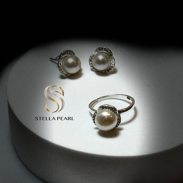 Bông tai bạc S925 hình hoa 3 cánh tròn đính ngọc trai thật 7-8mm màu trắng ánh hồng - Stella Pearl E52108