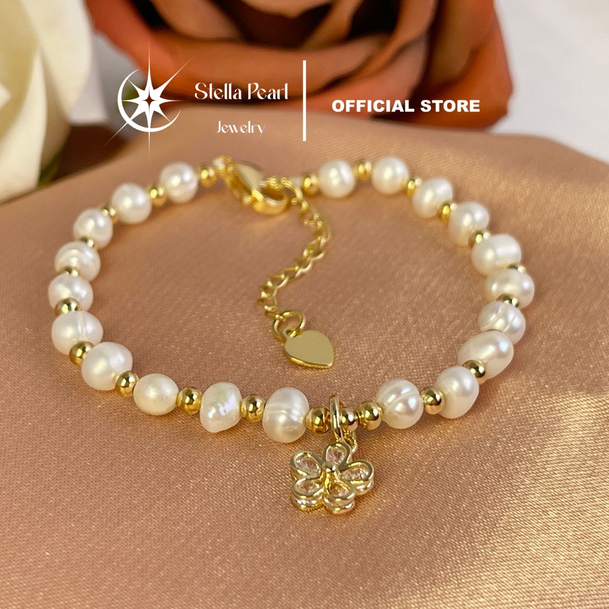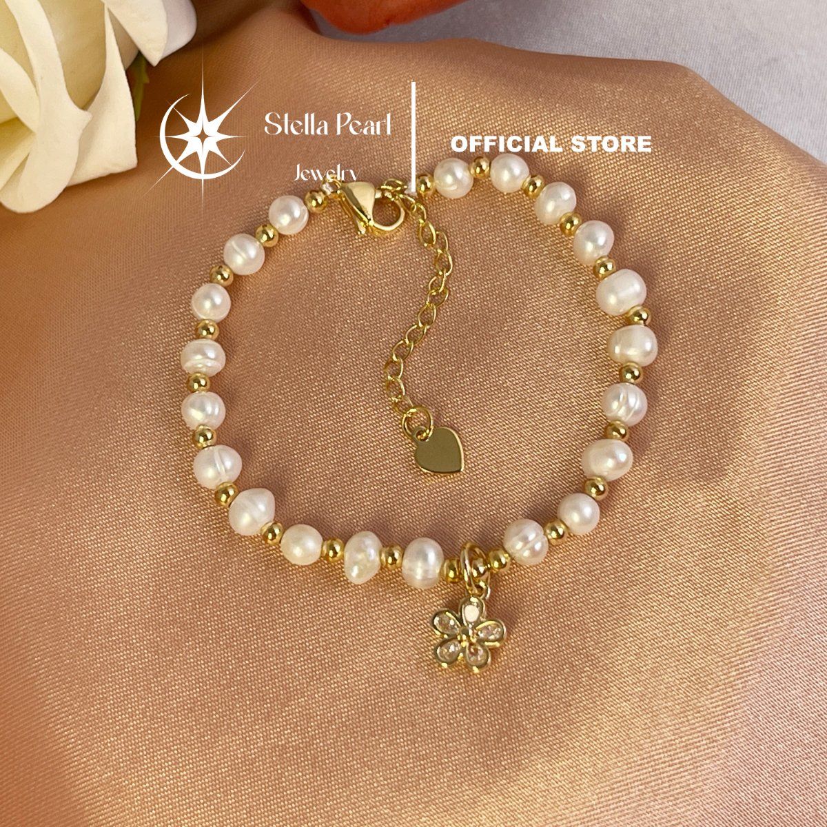 Vòng tay ngọc trai trắng 6-6.5mm charm hoa 5 cánh mạ vàng - Stella Pearl B58202